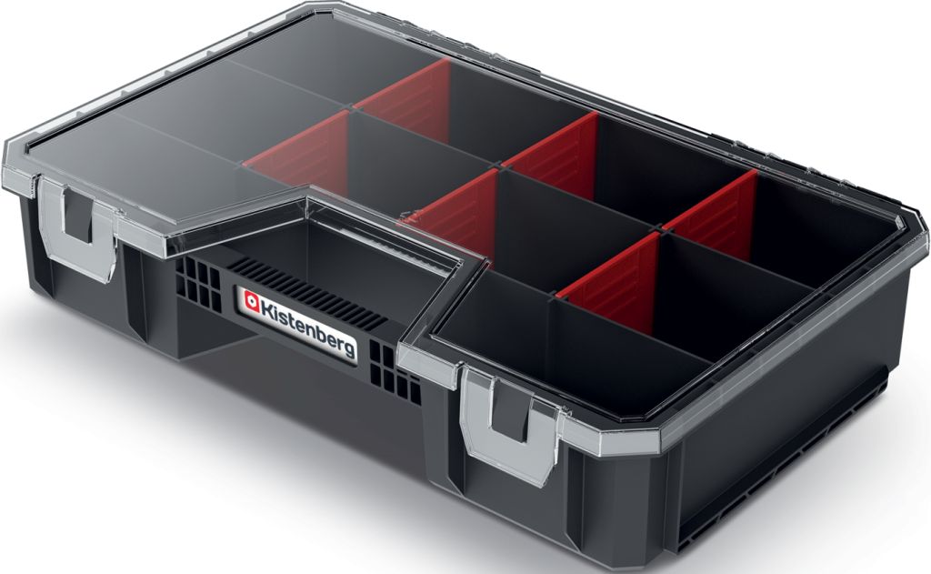 Organizer wyposażony w klapę z poliwęglanu występuje w wersji z demontowalnymi kubkami lub przegrodami.