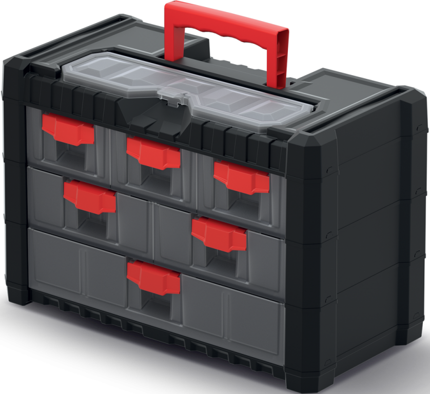 Produkt jest wyposażony w praktyczny uchwyt ułatwiający dźwiganie oraz transparentne szuflady w 3 rozmiarach.