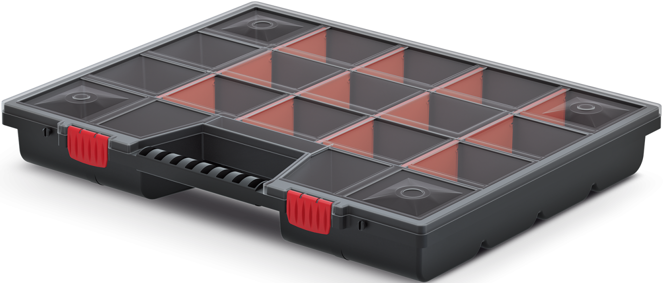 Transparentne pokrywy organizerów wykonane są z odpornej na uderzenia mechaniczne mieszanki polimerów.