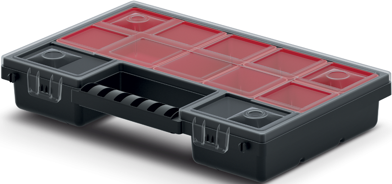 Transparentne pokrywy organizerów wykonane są z odpornej na uderzenia mechaniczne mieszanki polimerów.