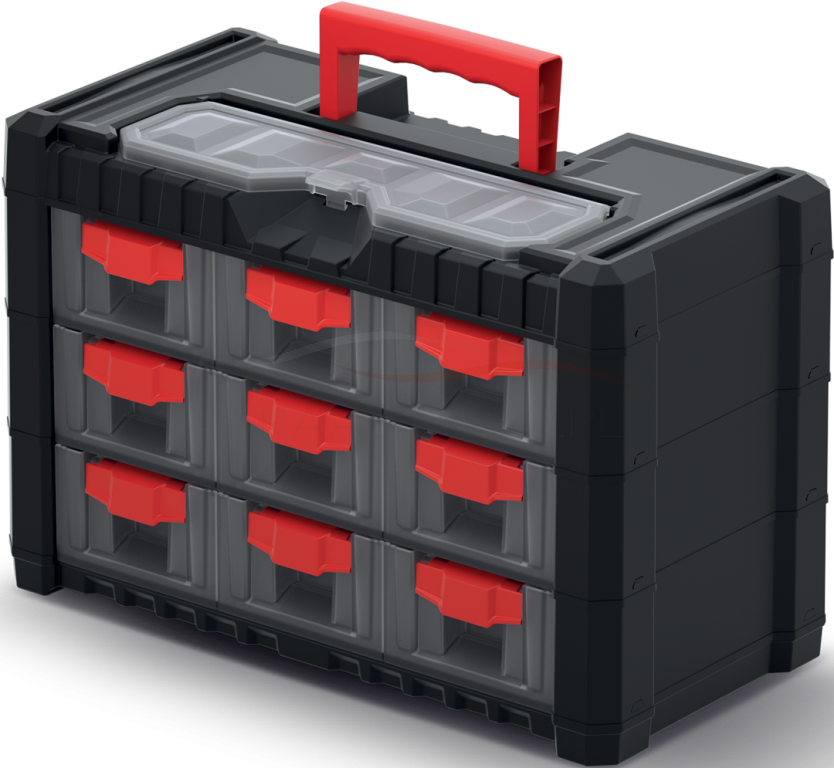 Produkt jest wyposażony w praktyczny uchwyt ułatwiający dźwiganie oraz transparentne szuflady.