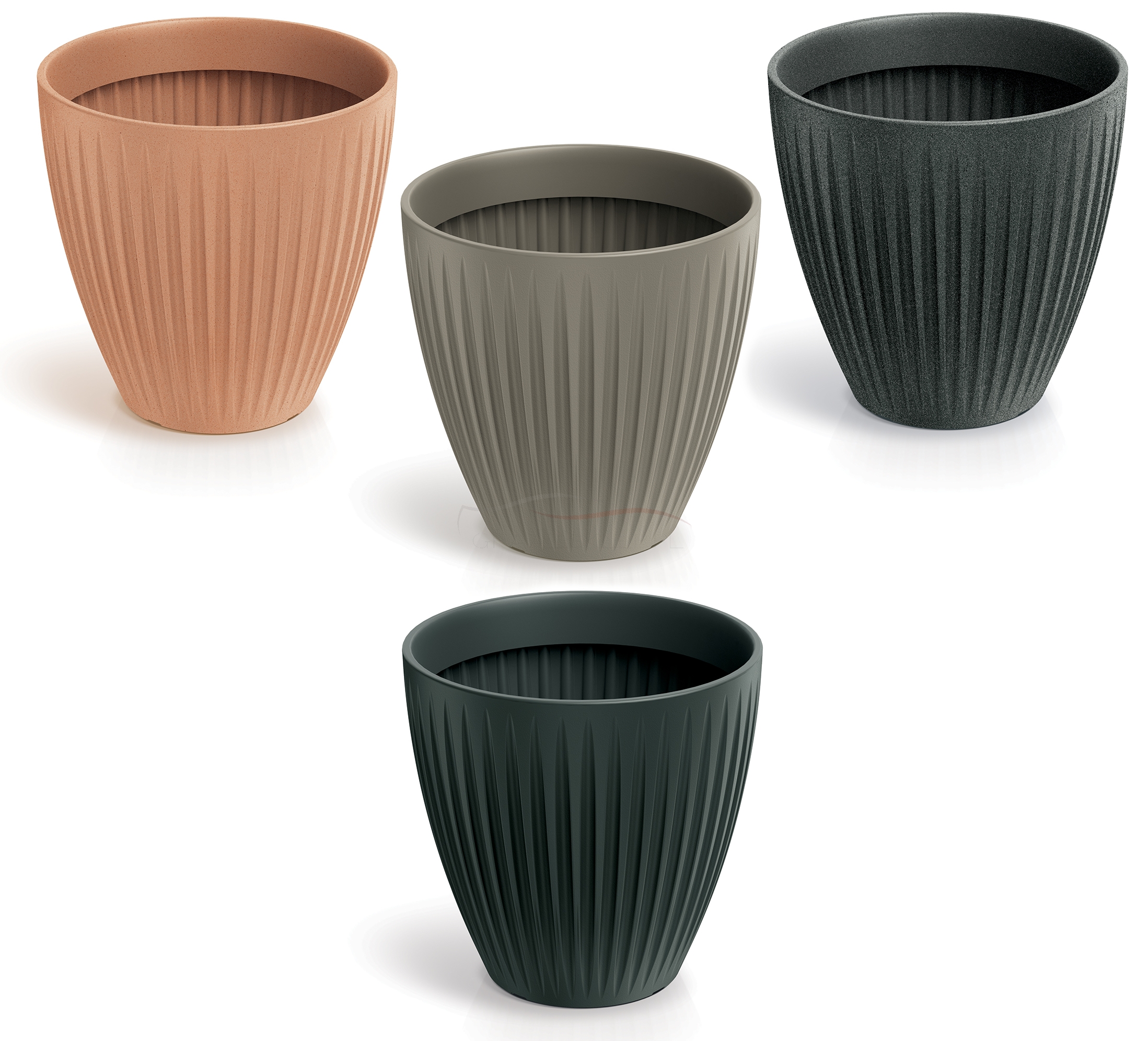 Powstałe w ramach serii Ethick donice Latia Round Midl od polskiej firmy Prosperplast eksponuje prosty, urzekający i klasycznie elegancki wzór, który przypomina estetyczny "odcisk" liści palmowych. A może kolumn greckich? Promieniste, podłużne żłobienia mogą budzić wiele przyrodniczych, idyllicznych czy starodawnych skojarzeń.