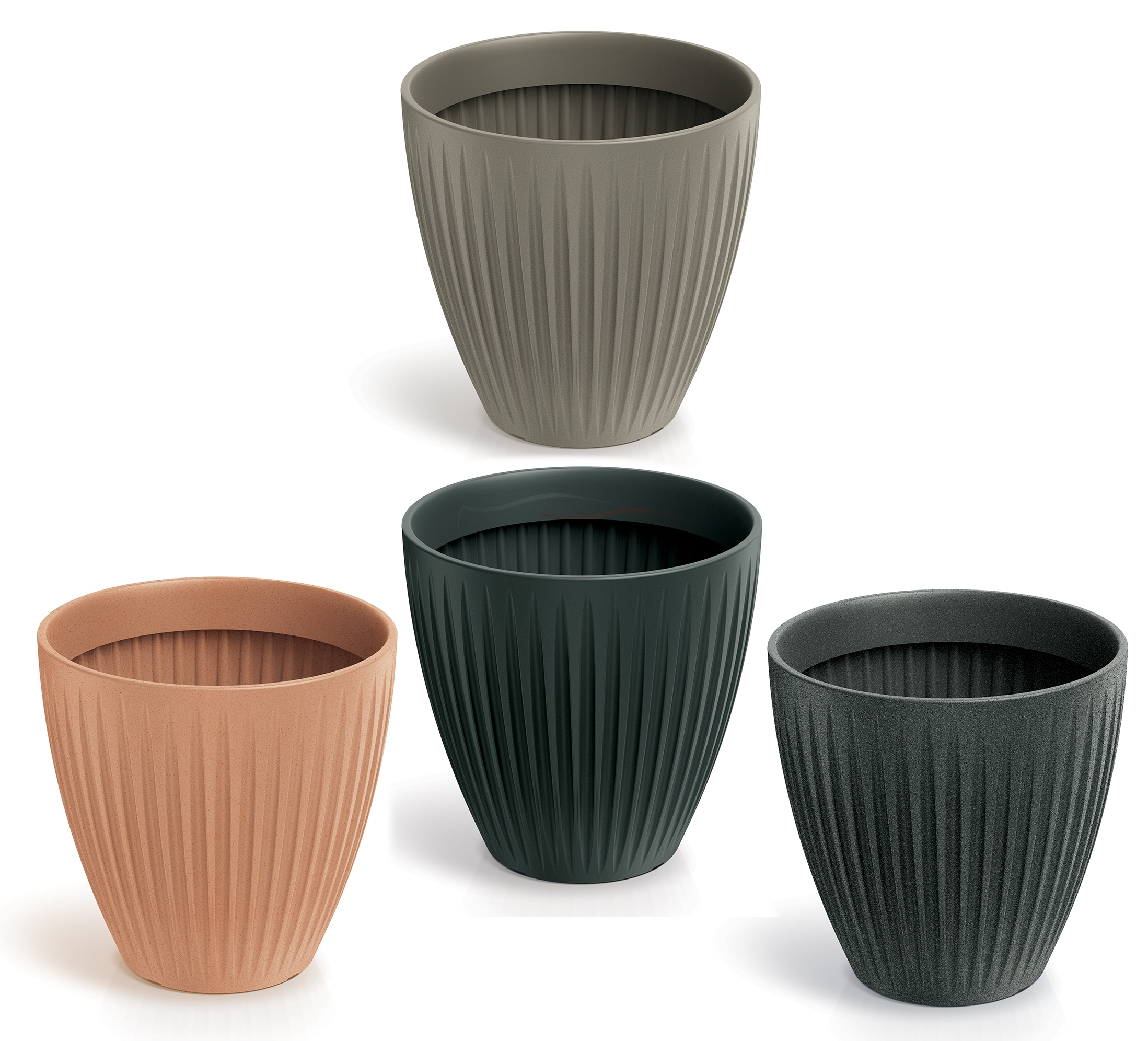 Powstałe w ramach serii Ethick donice Latia Round Midl od polskiej firmy Prosperplast eksponuje prosty, urzekający i klasycznie elegancki wzór, który przypomina estetyczny "odcisk" liści palmowych. A może kolumn greckich? Promieniste, podłużne żłobienia mogą budzić wiele przyrodniczych, idyllicznych czy starodawnych skojarzeń.