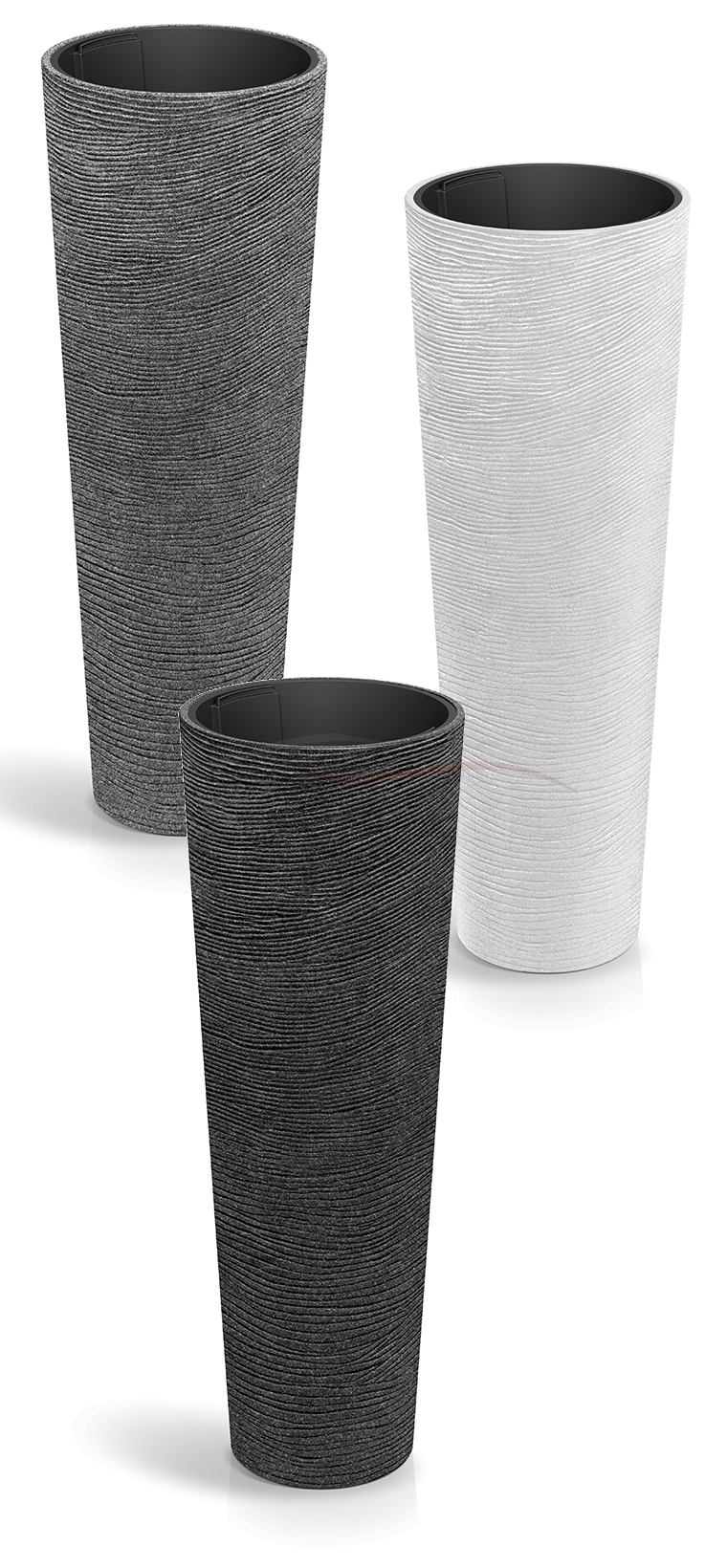 Donice Tubra Round slim high od polskiej firmy Prosperplast Powstałe w ramach serii Ethick, stanowią zamknięcie płynących, delikatnych rękodzielnych form żłobień w geometrycznej, trapezoidalnej sylwecie. Wygląda jak zastygnięty nurt płynącej wody. Albo jak linearne formacje piasku kształtowane wiatrem. Albo jakby ktoś oplótł surowy, geometryczny kształt cienką, delikatną włóczką... Istnieje wiele różnych możliwych interpretacji, które mogą wywołać u posiadacza te przyjemniejsze skojarzenia.