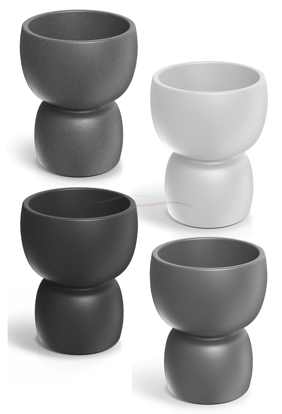 Prosta kompozycja i gładka faktura oparta na klasycznych formach ceramicznych czy też naturalnych przypomina zespolenie dwóch kamieni w jakimś procesie geologicznym, bądź niecodzienne ukształtowanie zarodka jajowego. Z takiego połączenia formuje się kształt piedestału, wynoszący (dosłownie i w przenośni) roślinę, czyniąc ją istotną w aranżacji.