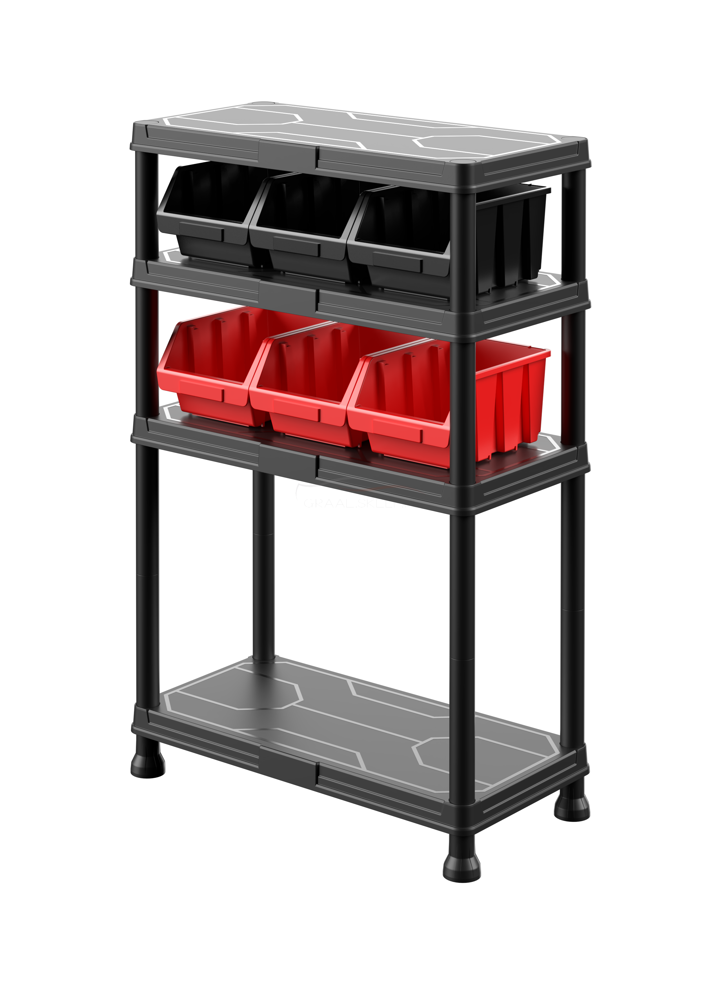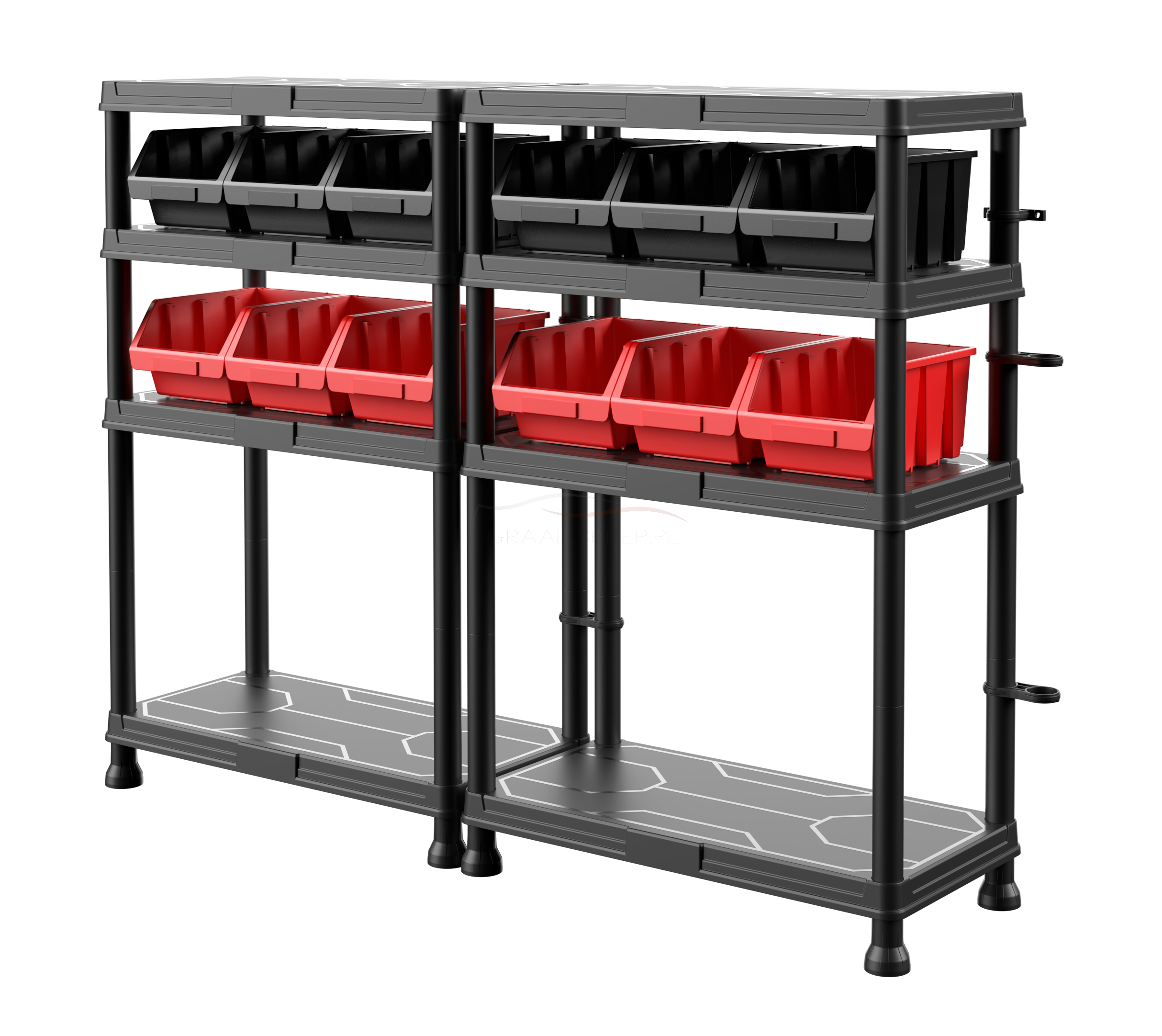 Nowość! W tym systemie regałowym zostało dołączonych sześć kuwet magazynowych Ergobox 3 - 3 sztuki w czerni i 3 sztuki w czerwieni. Zapewnia to jeszcze większą funkcjonalność - system oferuje możliwość przechowywania nawet drobniejszych przedmiotów.