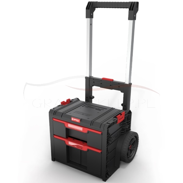 Qbrick System PRO Cart 2.0 Plus Drawer 2 to mobilna skrzynia na kołach wyposażona w szuflady. Posiada podwójną, teleskopową rączkę z możliwością demontażu oraz wygodny podest pod stopę pozwalają na pewny chwyt i łatwe manewrowanie na stosunkowo małej powierzchni. Duże – 9 calowe koła o szerokości prawie 6 cm pokryte są grubą warstwą gumy, co zapewnia bezproblemową trakcję w nawet najcięższych warunkach.