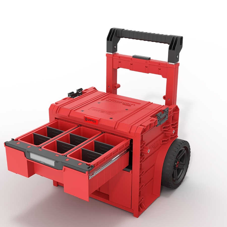 Qbrick System PRO Cart 2.0 Plus Drawer 2 Red Ultra to mobilna skrzynia na kołach wyposażona w szuflady. Posiada podwójną, teleskopową rączkę z możliwością demontażu oraz wygodny podest pod stopę pozwalają na pewny chwyt i łatwe manewrowanie na stosunkowo małej powierzchni. Duże – 9 calowe koła o szerokości prawie 6 cm pokryte są grubą warstwą gumy, co zapewnia bezproblemową trakcję w nawet najcięższych warunkach.