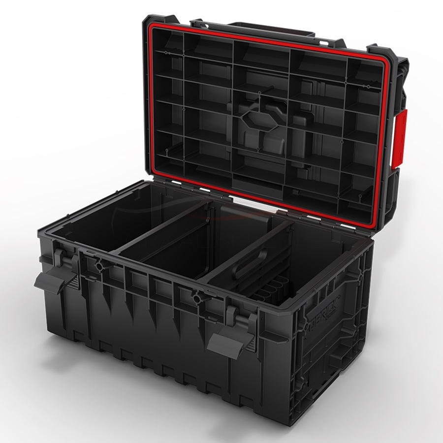 Wyposażona jest w dwie regulowane przegrody - jedną z elastycznymi paskami oraz drugą przegrodę Multi, która dzięki zróżnicowanym uchwytom na narzędzia ręczne pozwala w łatwy sposób utrzymać porządek wewnątrz skrzyni. Wyjmowana przegroda Multi może pełnić rolę samodzielnego nosidła na narzędzia.