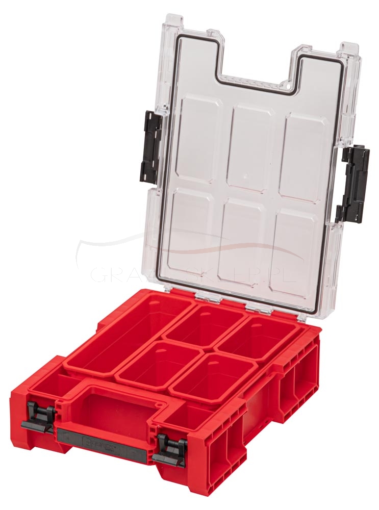W standardzie Organizer M Plus 2.0 jest wyposażony w 5 kubełków na akcesoria, w tym 4 mniejsze oraz jeden podłużny do przechowywania i transportu podłużnych elementów Twojego warsztatu. Dodatkowo zawartość organizera jest zabezpieczona przed wnikaniem wody i pyłu poprzez elastyczną uszczelkę zamontowaną w poliwęglanowej pokrywie. Specjalna blokada pokrywy organizera zapobiega przed jej niekontrolowanym opadaniem.