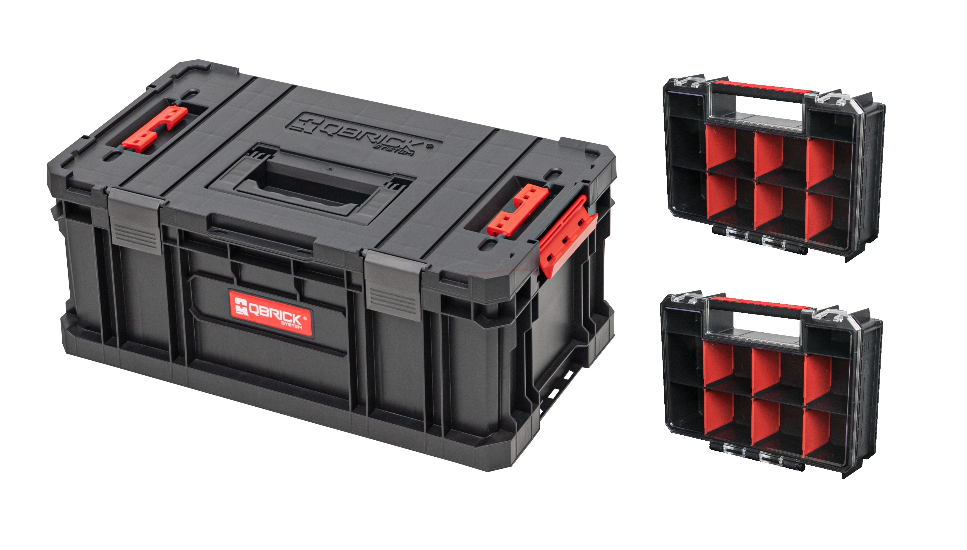 Modularna, wytrzymała skrzynka narzędziowa z poliamidowymi zapięciami i solidną rączką.