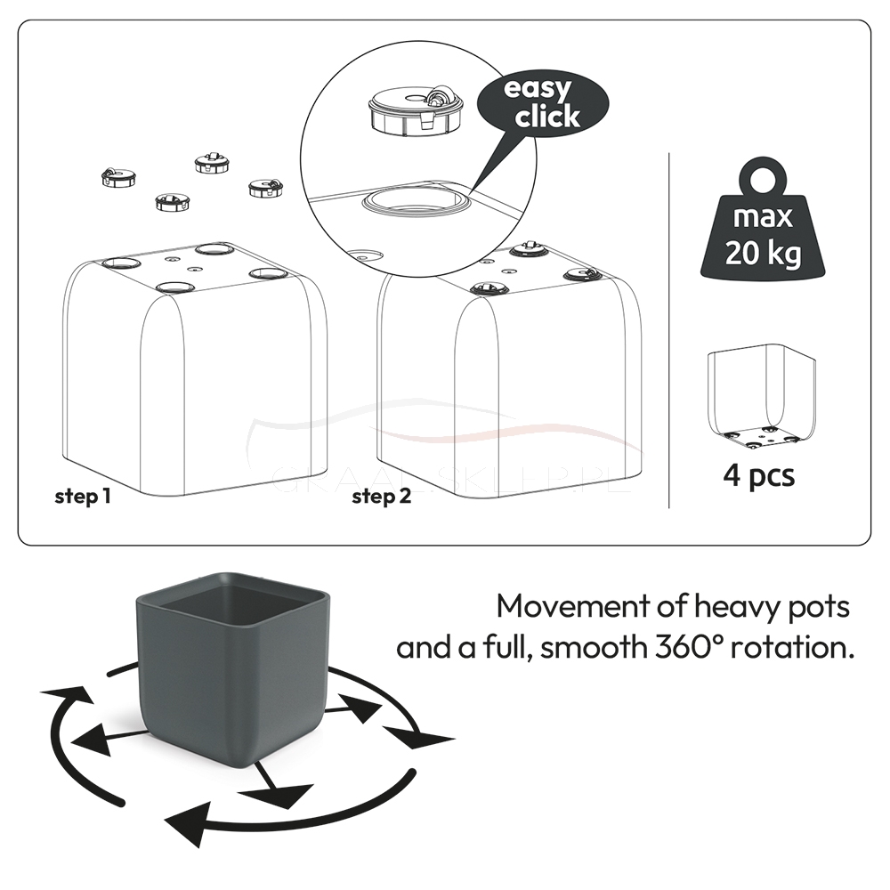 Każda sztuka jest niewielką plastikową konstrukcją z osią obrotową i kołem jezdnym. Po włożeniu w gniazdo podstawki lub donicy, obraca się w nim, a koło na spodzie pozwala na przesuwanie donicy po płaskiej powierzchni.